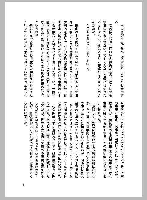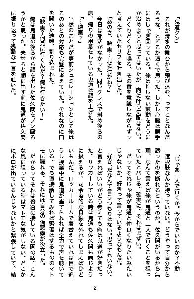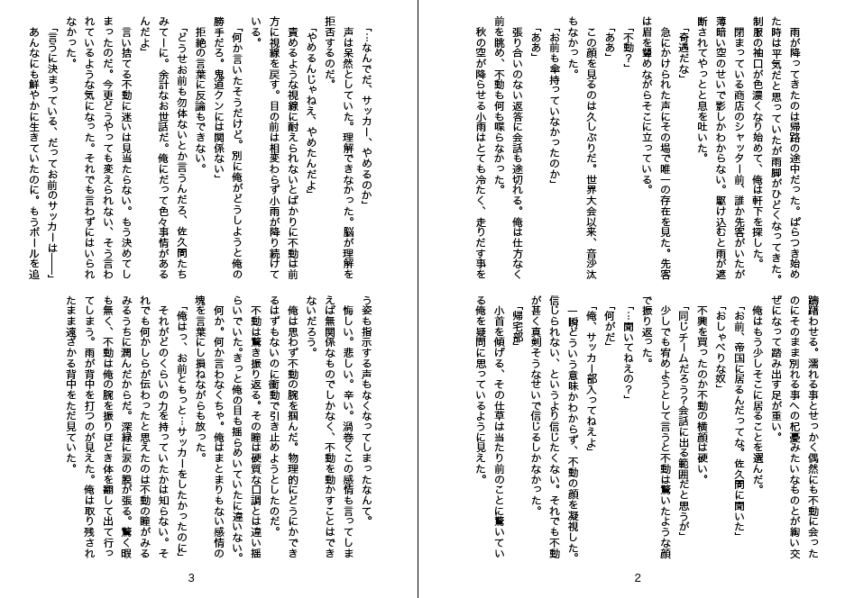 | 「無題(エゴ)」 |  | コピー本。A5/P12/無料配布/2011,10,23発刊(在庫なし) きどふど。サイトにアップする予定。 あきおにサッカーをやっててほしいおせっかいな鬼道さん。 実質8ページしか本文がない。ペーパー代わりに。