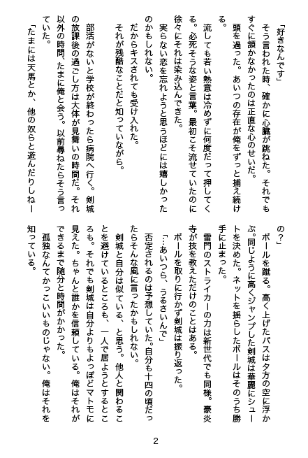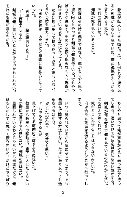 | 「すき×すき」 |  | コピー本。A5/P16/200円/2012,4,15発刊 天京。 天馬は剣城に見つめられていることに気付く。京天でも読めそう。 無駄に特殊紙。表紙レース加工。 |