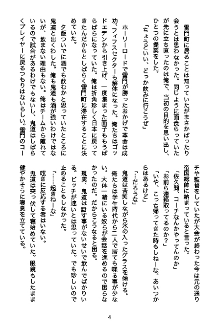 | 「酒と源田と鬼道と不動。」 |  | コピー本。R18/A5/P30/200円/2011,7,17発刊(在庫あり) 大学生きどふど。サッカーは全然でてこない。 源田がめっちゃいいやつで明王と仲良しだったら萌える、という妄想からできた話。別の見所:コピ本だけど無線綴じ。 |